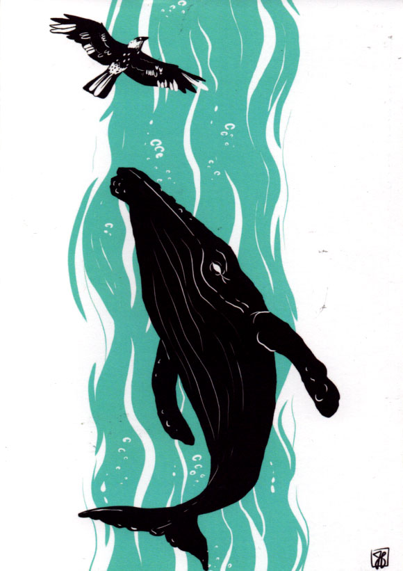 Perhaps most striking is the art. The whale and the birds are beautifully rendered – I imagine a lot of observation and reference work by the author. The colour palette is in shades of striking sea-green – cold and fresh, even a little eerie.