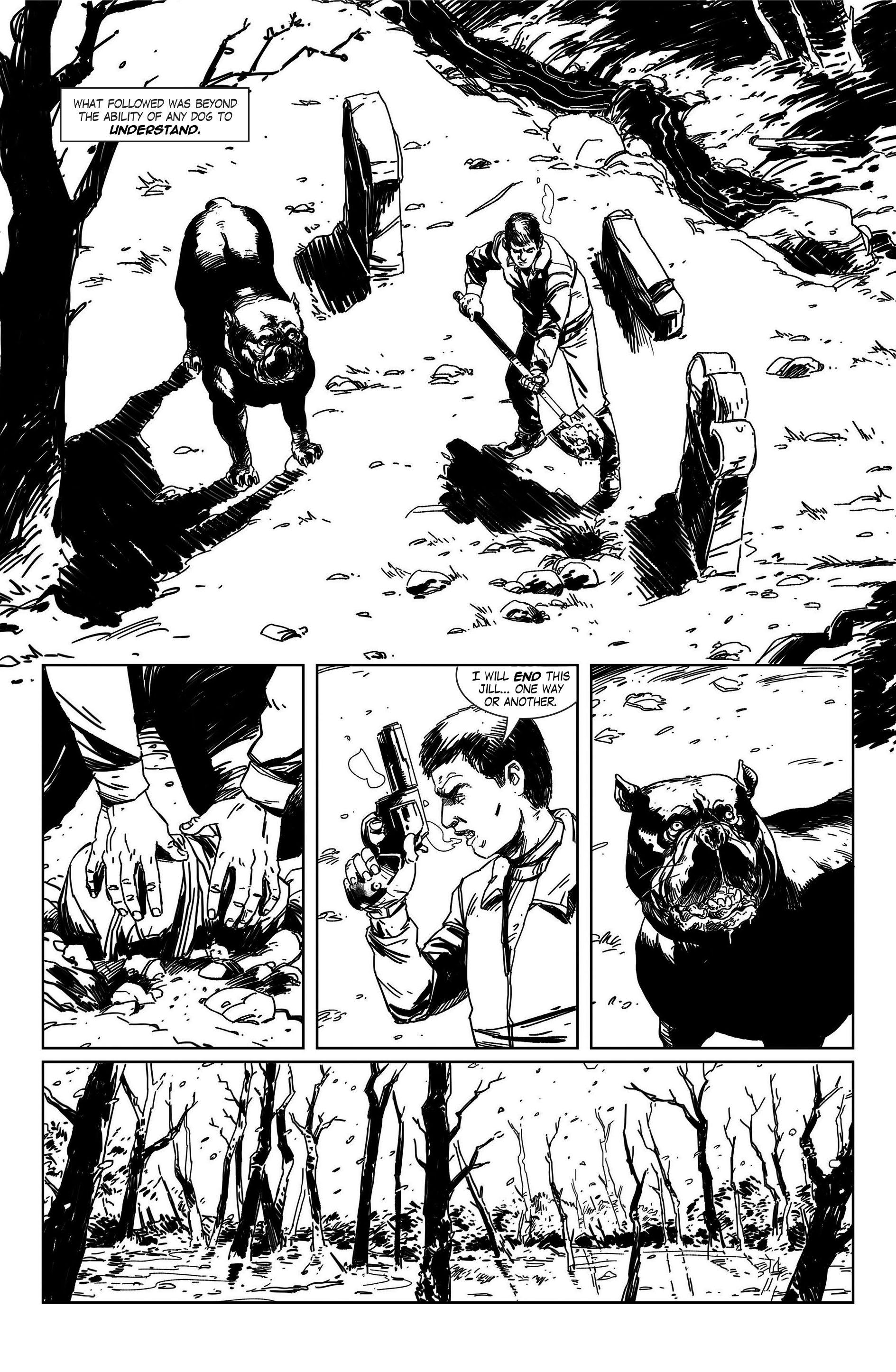 Gustavo Vargas does a fantastic job with the art. I loved his Peruvian cyberpunk tale L1MA but whilst that was sun-drenched and lit by crackling pre-Colombian colours this black and white tale has a different feel as you would expect for such a different setting. I especially loved his work with the dog Goth with his hulking black form and rippling muscles and slavering jaws. The villainous nemesis Mr Jones is another highlight with his menacing cadaverous visage.