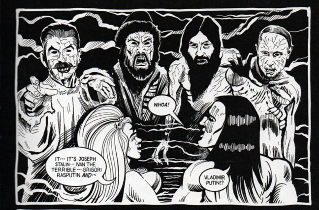 This incarnation sees writer John R Short and artist Andrew Richmond try their hand at the character. This time a bit of Hammer horror has been added to the mix. Octobriana and her sidekick American Brave are lured to a strange land. Mystic forces are blocking their return and they set out to find the cause of their peril. They find themselves in a land populated with familiar faces from 70’s movies like Dracula or Frankenstein. Our heroes encounter a variety of two dimensional peasant maids and terrifying monsters. Ultimately battling zombie versions of historical and current Russians including Rasputin, Vladimir Putin and Stalin.