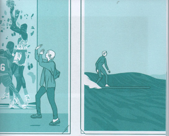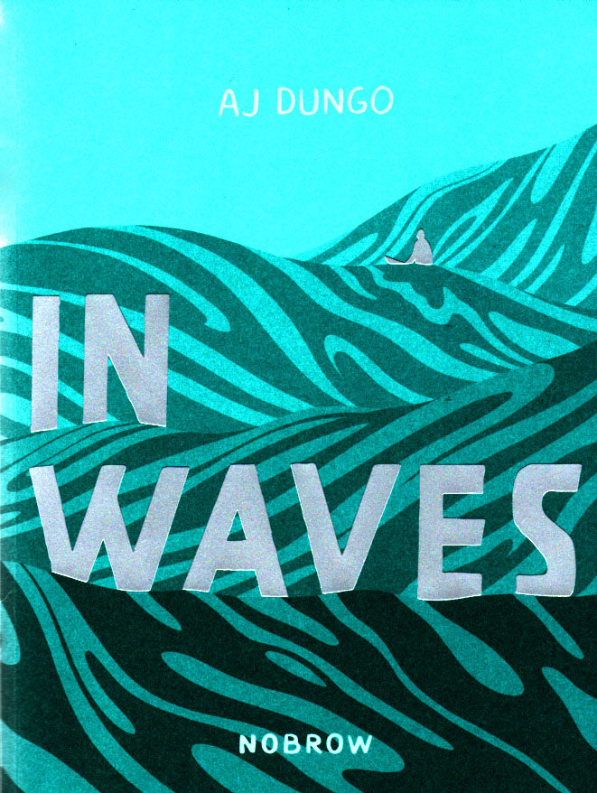 So I stuck on a few surf tunes and dived into In Waves. The first thing that strikes you about this book is how beautiful it is. NoBrow have done a commendable job of production. The turquoise toned cover with silver lettering (and surfer) is striking.