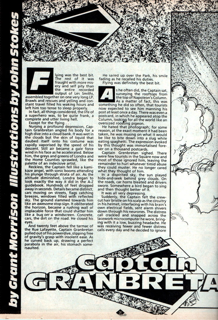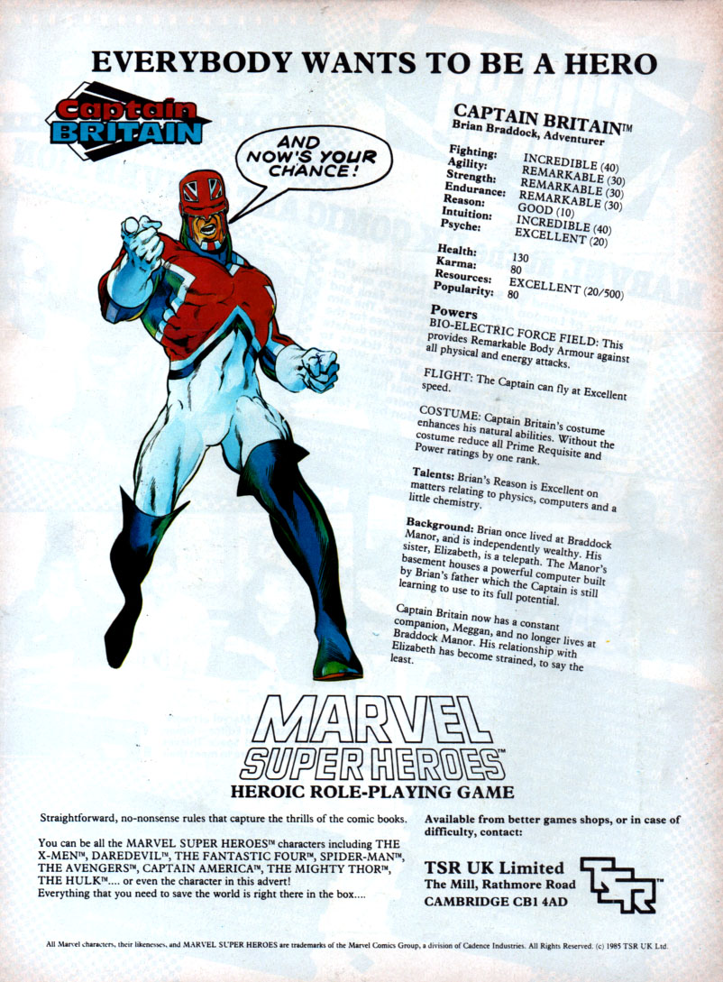 It was quite an issue in many ways. It also featured a text story by one Grant Morrison – Captain Granbretan with illustrations by John Stokes. There was also spin-off strip The Cherubim by Mike Collins and Mark Farmer and some reprint Black Knight (Steve Parkhouse and John Stokes) and Night-Raven (Steve Parkhouse and David Lloyd) strips. The icing on the cake was a Night-Raven fact-sheet (or Mastermind Specification Scan) and an ad for the Marvel Superheroes tabletop RPG game featuring stats for Captain Britain. Good times.