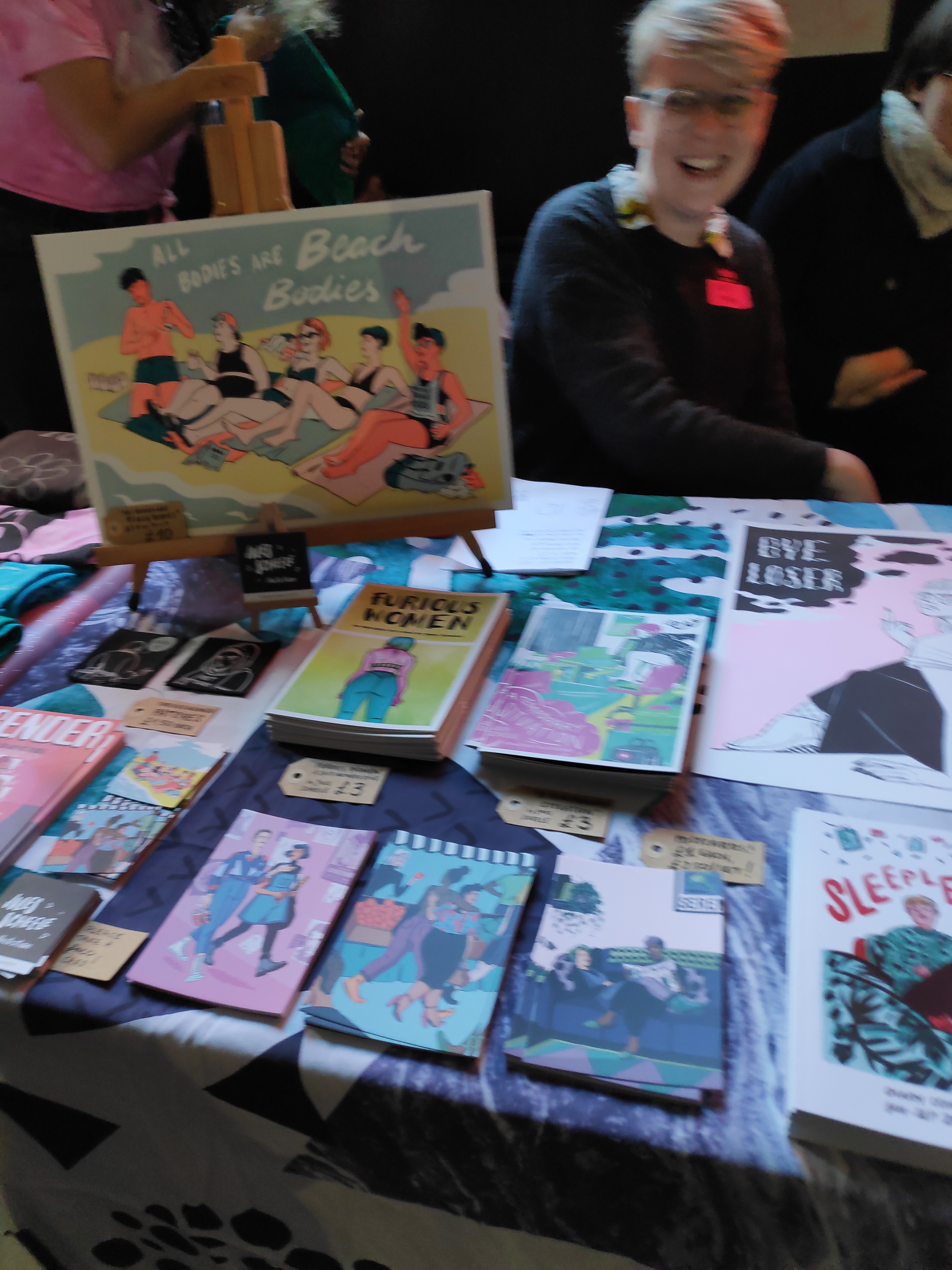 Steven Fraser works in the area of mental health in writing, comics and film (and probably lots of other areas I don’t know about). He had a work about rejection, which included a scrunched up page of a comic, literally thrown in the bin. I wish I had got that now, but I did pick up Interview-ABC and Coming Out Autistic. Interview – ABC seeks to give a voice to people who are dealing with mental illness. Steven explains “Art can be a therapeutic and expressive way of conveying emotions and problems and with Interview ABC I wanted to show how verbal communication can be presented on a page.” Coming Out Autistic is a zine containing interviews with people “who are LGBTQIA+ and how they tell others they are autistic”. I’d recommend both books both for the illustrations which are bold and colourful with a surreal and underground feel and because, well, you’ll probably learn something. I know I did.