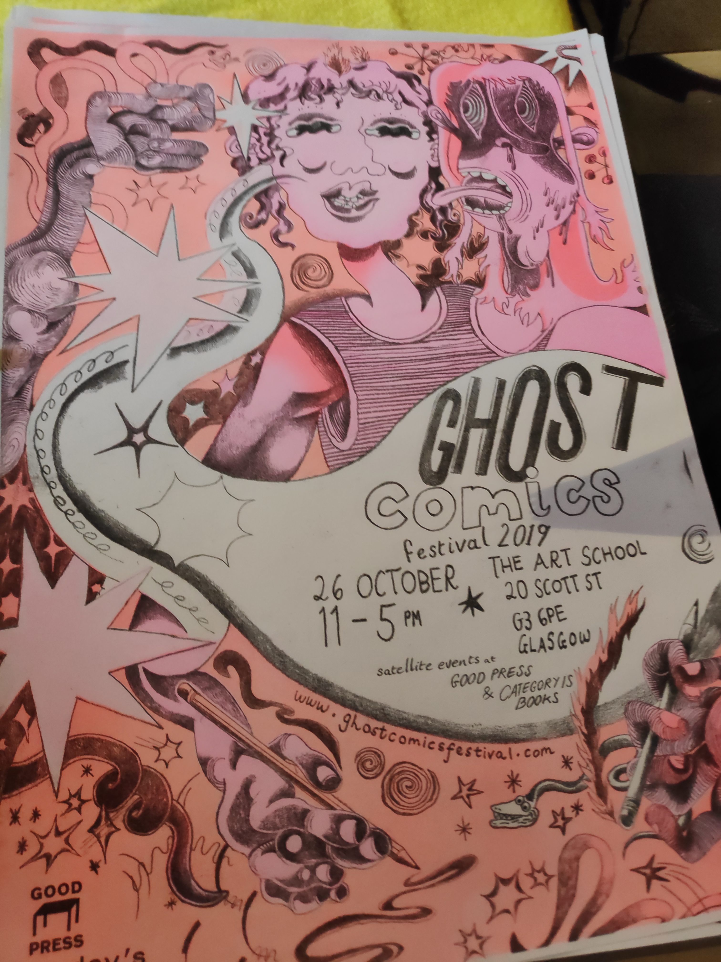 I dropped in on the Ghost Comics Festival at the weekend. This was a new event for me – I only heard about it a few days before, and it so happened I was going to be in Glasgow that day. There were a number of other events running as part of the festival including workshops in collaboration with Good Press Gallery and Category Is Books.