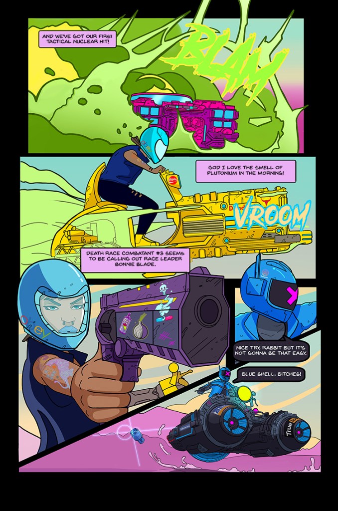If you enjoy cutting edge comic technology and a fast moving story with a video-game aesthetic then check out Neon Wasteland. But most of all Neon Wasteland is creative and is an adventurous exploration of the limits of the comics medium and beyond.