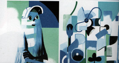 Skip is a sensory work. We travel through worlds experiencing moods and cultures through pattern and colour. Bold, swirling colours seize us and drag us forward, like Bloom is dragged through the hole and away from the lake. Clashing, contrasting hues bring to mind the colours of the Fauvists but with the free expressionist brush strokes. At one point the adventurers find themselves in an art gallery, but their whole adventure is an art gallery.
