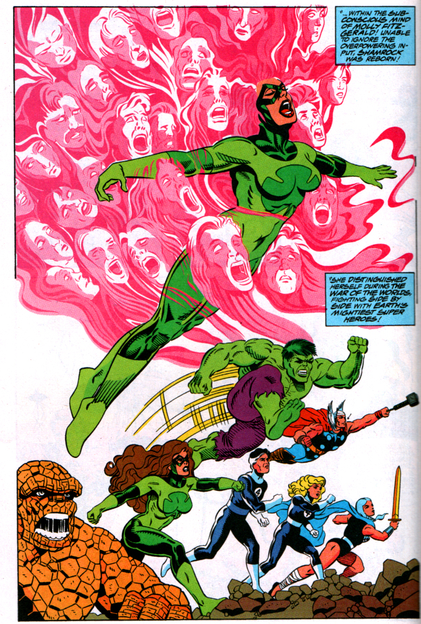 Happy St. Paddy’s Day, and great article! Over here at Heroineburgh, we are indebted a bit to the pioneering appearance of Shamrock (I bought Contest of Champions the week it came out) in our Bronze Age tribute comic book series and TV series, which features our Irish superheroine Fianna, aka rookie cop Fallon O’Shaughnessy, who joins the Pittsburgh Police force in her father’s footsteps, but when there’s a problem the cops can’t handle, she speaks her word of empowerment and transforms into a superhuman banshee warrior. She’s also a lesbian, and gets tangled in a love triangle between her human girlfriend and one of the lovely ginger heroines of her League. She’s a little bit o’ Shamrock, a little bit o’ Banshee, and lot of the Boudicca legend. Slainte is tainte!