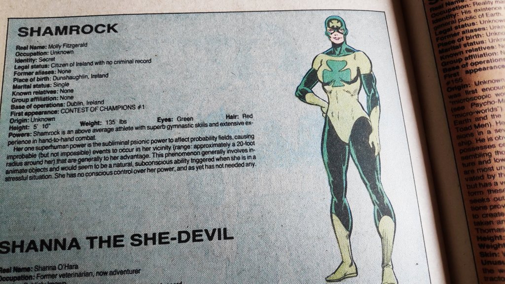 Shamrock of course had her own Official Handbook of the Marvel Universe appearance not to mention a rather cheeky mention in a Wizard Magazine calendar as the St. Patricks Day entry.