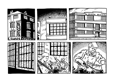 In many ways the neighbourhood of the Three Kings is the starring character of Slang Pictorial. Panels with city streets, drainpipes, shop signs and of course people bring that place to life. The sites and smells come to life, but especially it is the snappy dialogue that stands out with yiddish, jamaican and cockney dialects running together to give a flavour of a unique place and time.