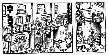 There are hints of Seth’s nostalgic style, especially with some of the buildings, but this book is not as backwards looking or melancholy. The use of shop windows and external signs for titles is a nice tip of the hat to Eisner’s Spirit whose grubby streets packed with human stories are called to mind.
