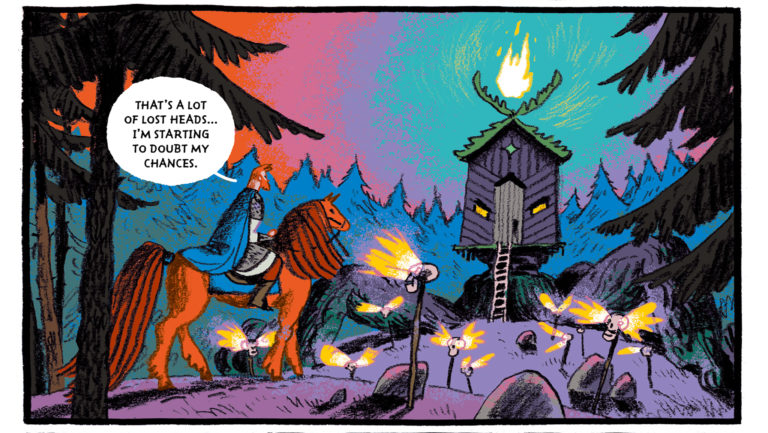 Alexander Utkin’s illustration style is warm and enchanting. Feisty heroines, mysterious crones and otherworldly goddesses come to life with individuality. The softly penciled characters and bold colours conjure up classic children’s literature (which this certainly is) but the often dark themes are reflected in the blank faces of the wooden warriors and the uncanny colour palette. Eldritch flames are conjured up in yellow and glowing green. Dark rooms are illuminated by firelight.