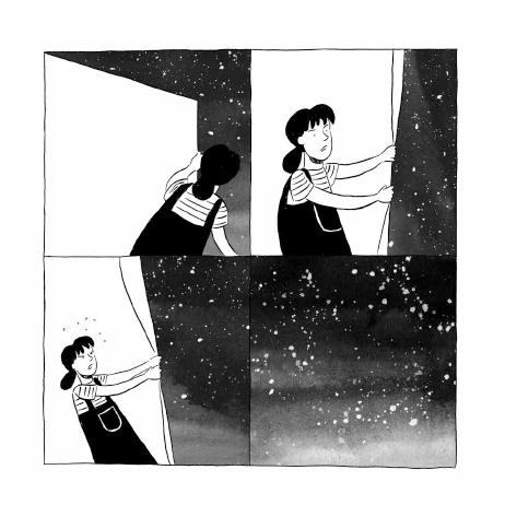As she navigates her way through this environment so we travel with her through the pages of the comic. The comic medium is used ingeniously with the character moving between panels as they shift between states and themes. Most pages have a four panel grid and characters break through them, lie on top of them, tear them down or just walk out of them.
