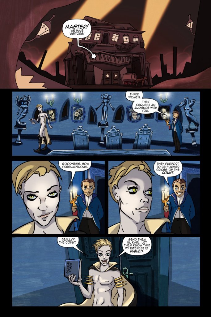 The book has a webcomic feel with a cartoonish and manga influenced art style. This serves to lighten the horror element and whilst there are plenty of jugular veins being tapped it is not too graphic. Overall the area most heavily explored is the fetishistic side of vampirism. The three vampire ladies don’t all adhere to vampire or human body shape clichés and have sexy times with various handsome humans and each other.