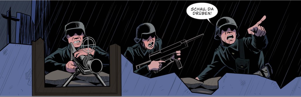 Despite this rather blunt analogy, the story itself is quite simple. For me, it evoked the tradition of British war comics. D.C Thomson’s Commando would be an obvious comparison, but the typical Commando story is a fair bit longer. It was closer to a short strip that might have run in Victor or Warlord. This is by no means a criticism. This book delivers a tight, engaging story.
