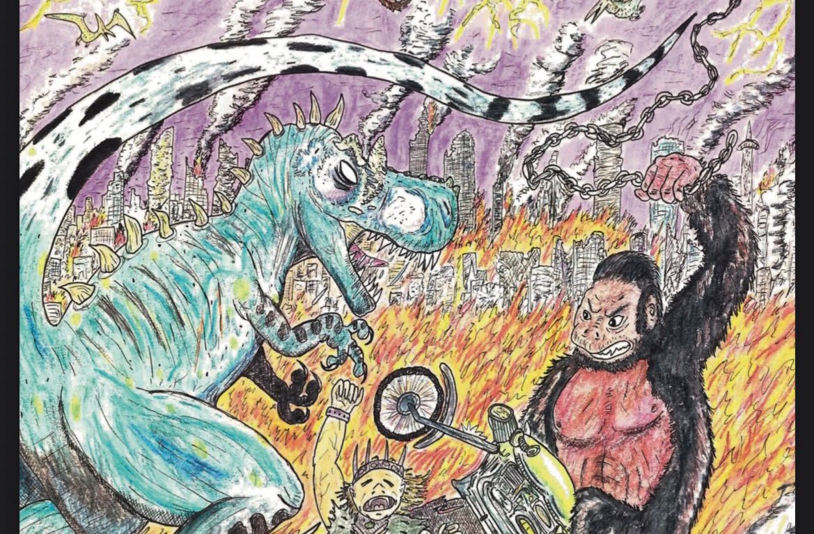 It is a packed book with no less than 14 individual strips many in full colour. Mike Sedakat’s spectacular cover features a dinosaur fighting a giant gorilla on a motorbike as a city burns in the background. I would say this sets the tone, but I’m not sure anything could really live up to that.