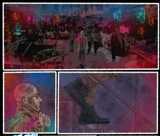 The changed scene is made evident in multiple ways. Firstly the artist changes. The naturalistic, sunlit images of the first dream, illustrated by Edgar Salazar give way to a harsher, dark and rain-lashed neon lit world visualised by artist Rolands Kalniņš.