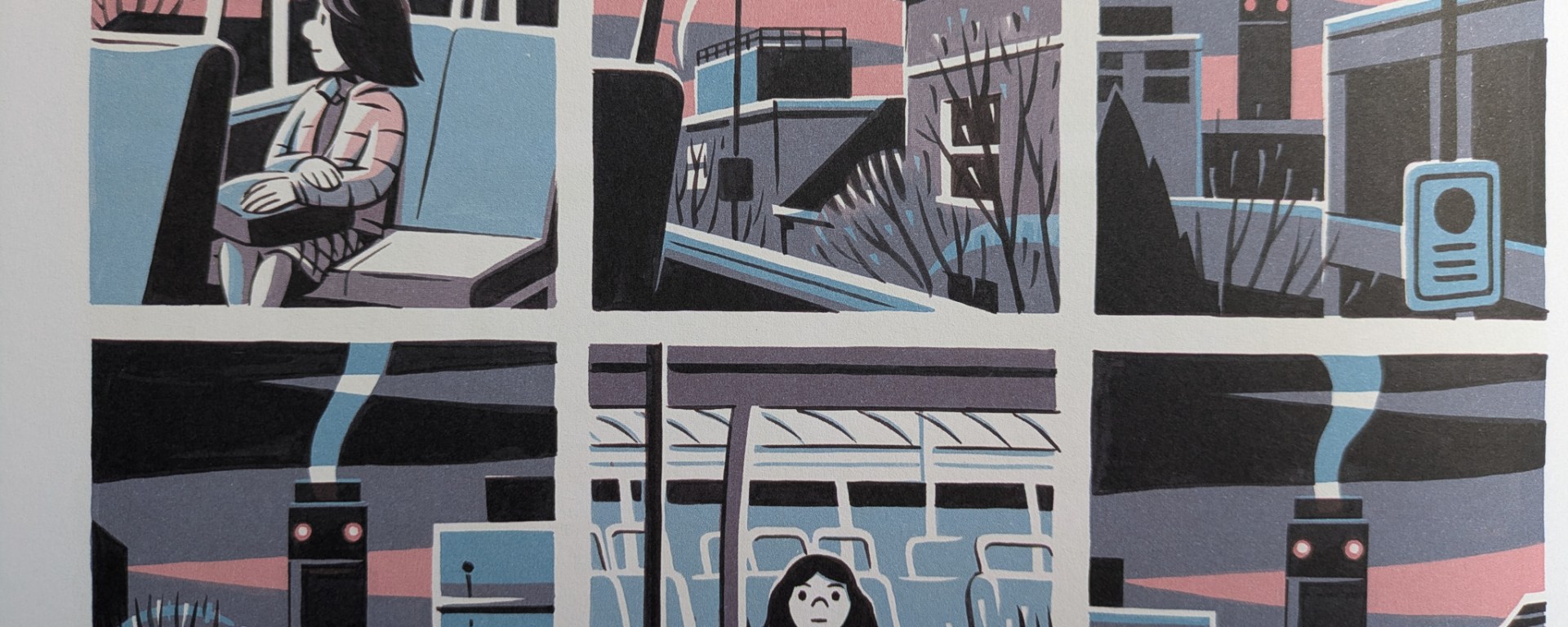 The book is a wonderful object in itself and the colouring technique mentioned above produces stunning results giving the book that dreamlike twilight feel of autumns and winters as evenings grow darker. The light and the city environment is central to the book as our teenage protagonists slouch around parks and stare out of the windows of buses. Character expressions are simple, even minimal – we all know that this is no barrier to displaying emotion (just pick up any Peanuts book) – but it is the wider world around them that serves to convey feeling.